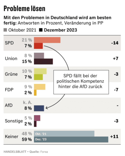 Allerdings das deutsche Wählervolk in den Umfragen bestätigt aufs Ausdrücklichste: Problemlösungskompetenz in der Politik trauen im Dezember 2023 noch 2% der Bevölkerung der FDP zu, im Oktober 2021 waren es noch 9%, also mehr als 400% zu dem heutigen Wert. In der in den Köpfen der Wähler wahrgenommen Problemlösungskompetenz erhält die FDP als regierende Partei nur ein Viertel der Kompetenz, die mittlerweile der AFD zugesprochen wird. Der AFD wird und wurde genau diese Kompetenz stets von den anderen Parteien generell abgesprochen. Schlimmer kann es in der Wählerwahrnehmung also für die FDP gar nicht kommen.